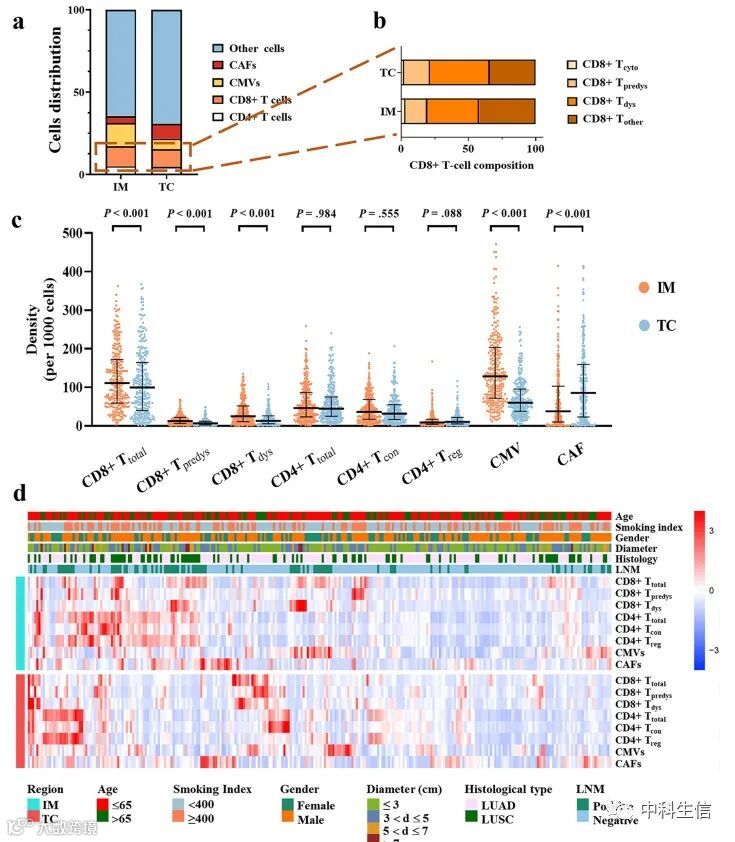 使用mIF在TME中鉴定了CD8+ T细胞功能亚群和其他细胞群,包括癌细胞、CD4+ T细胞、CMVs内皮细胞和CAFs。为了确定在TME检测到的细胞群体区域分布的差异,比较了它们在IM和TC中的密度。间质细胞亚群的相对组成显示了IM和TC之间的巨大异质性(图2a)。值得注意的是,部分CD8+ T细胞表现出功能失调状态(图2b)。具体而言,与TC相比,IM中CD8+ Ttotal细胞、CD8+ Tpredys细胞、CD8+ Tdys细胞和CMVs的密度较高,CAFs的密度较低(P < 0.001)。IM和TC包含几乎相等密度的总CD4+ Ttotal细胞和常规CD4+ T细胞(CD4+ Tcon)。尽管没有统计学意义,但TC具有稍高密度的调节性CD4+ T细胞(CD4+ Treg)(P= 0.088)(图2c-d)。