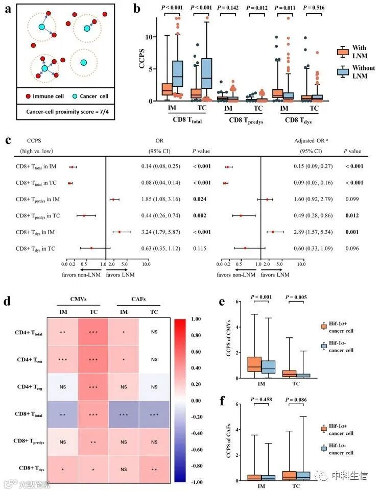 类似于细胞密度,CCPS首先在有和没有LNM的患者之间进行比较。在LNM患者中,IM和TC中CD8+ Ttotal细胞的CCPS低、TC中的Tpredys细胞的CCPS低、IM中CD8+ Tdys细胞的CCPS高(图5b)。