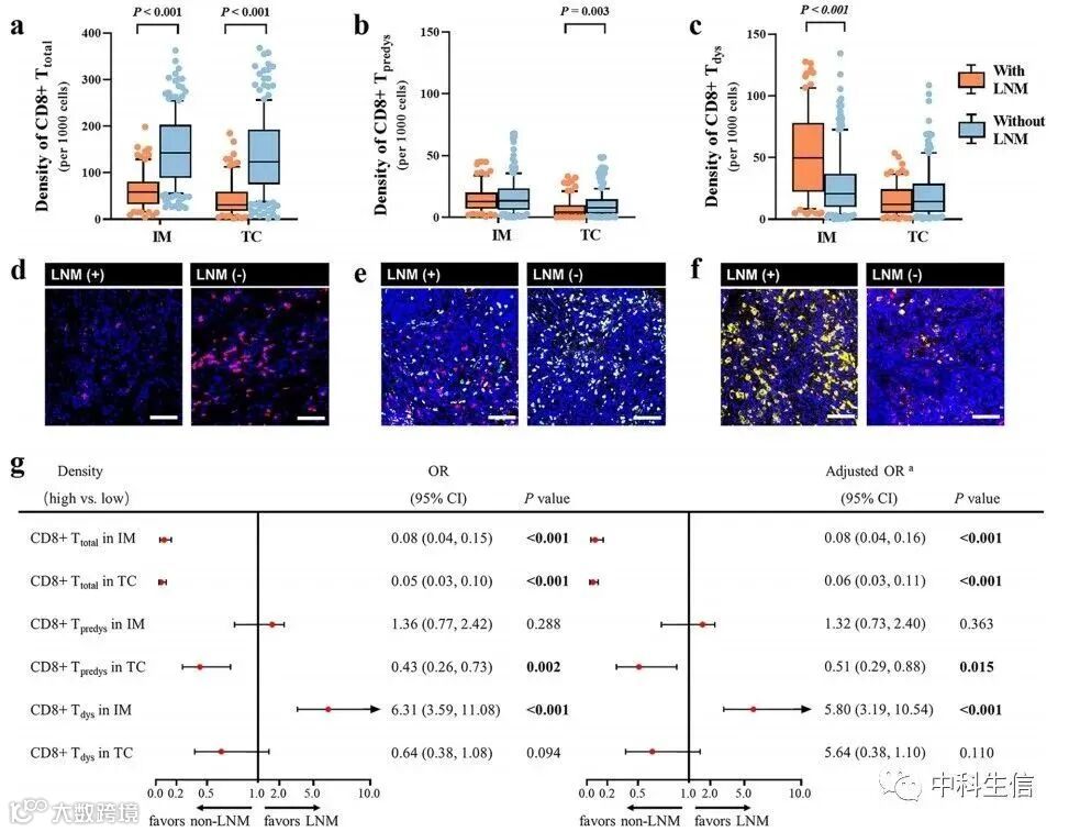 随后,建立单变量和多变量模型来检验肿瘤内CD8+ T细胞亚群的CCPS与LNM和预后之间的关系。根据临床病理因素(包括年龄、性别、组织学亚型和肿瘤直径)进行的多变量逻辑模型显示IM中CD8+Ttotal细胞的低CCPS、CD8+Tpredys细胞的低CCPS、CD8+Tdys细胞的高CCPS与LNM显著相关(图5c)。