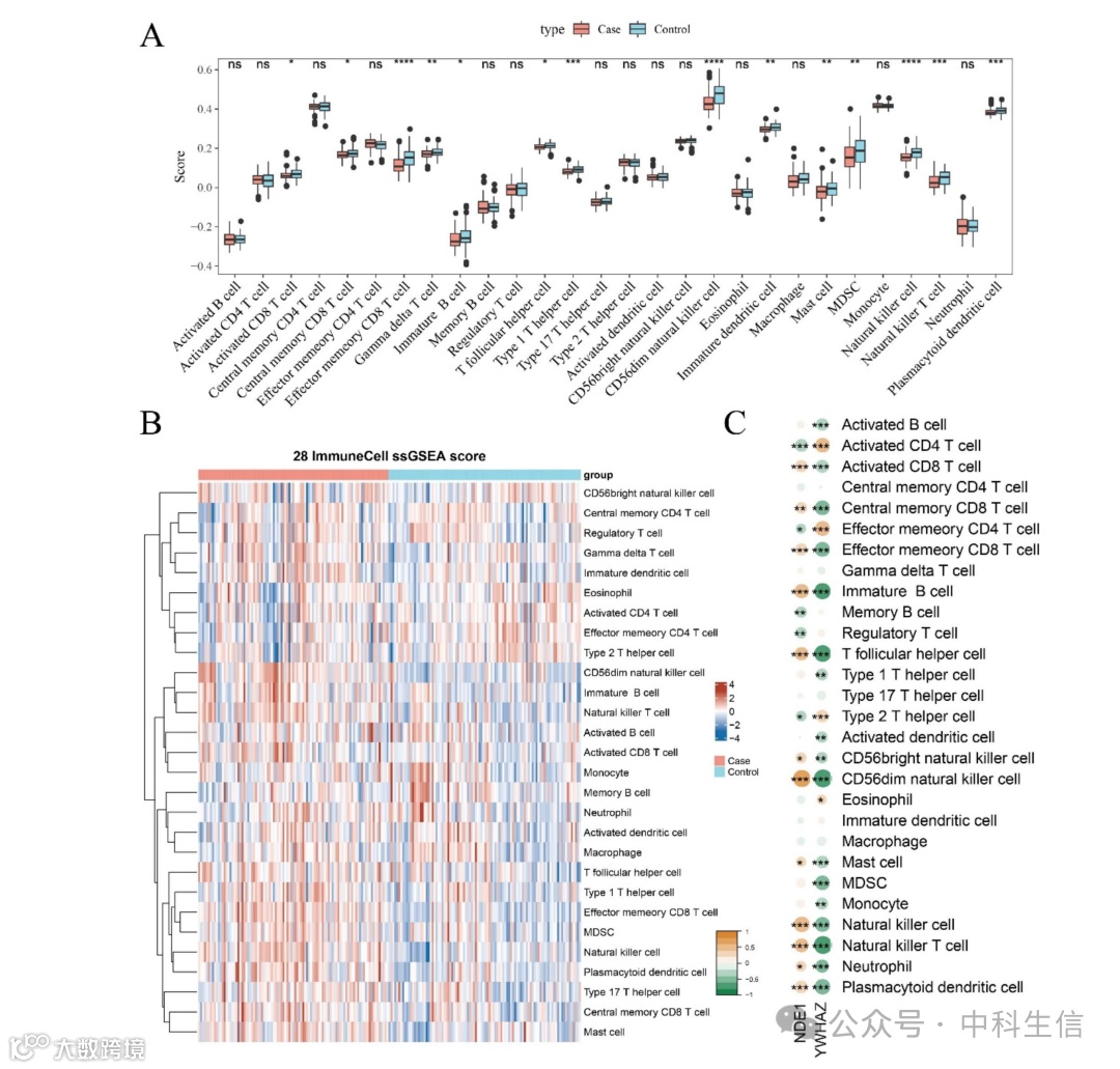 免疫细胞浸润分析结果显示,对照样本中一半的免疫细胞,包括自然杀伤细胞、浆细胞样树突状细胞、效应记忆CD8 T细胞和1型T辅助细胞,显著高于AD样本(图6A、B,p < 0.05)。接下来,分析了免疫学评分与YWHAZ和NDE1基因表达之间的关系。结果表明,NDE1的表达与激活的CD4 T细胞、效应记忆CD4 T细胞、记忆B细胞、调节性T细胞以及2型T辅助细胞的浸润呈负相关(图6C,p < 0.05),而与其他免疫细胞类型的浸润呈正相关(图6C,p < 0.05)。YWHAZ的表达与激活的CD4 T细胞、效应记忆CD4 T细胞、记忆B细胞、2型T辅助细胞和嗜酸性粒细胞的浸润呈正相关,而与其他免疫细胞类型的浸润呈负相关(图6C,p < 0.05)。
