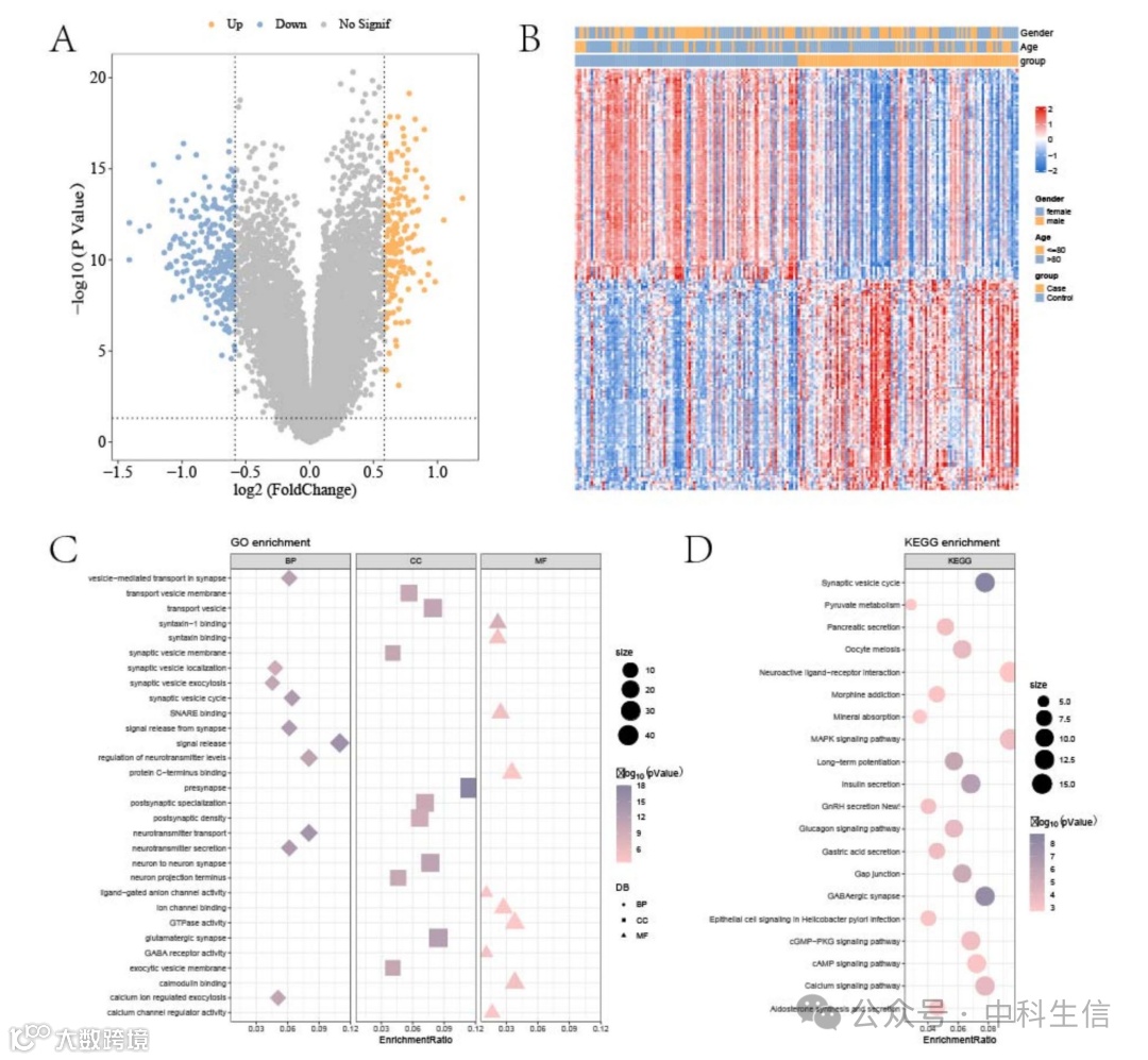 共识别出417个差异表达基因(DEGs),其中257个基因下调,160个基因上调(图2A)。接下来,生成了AD样本和对照样本中前100个差异表达基因的基因表达热图,以探讨这些DEGs与临床特征(性别、年龄、≤ 80/ > 80岁)之间的关系。观察到上调基因与下调基因的表达模式呈负相关(图2B)。GO和KEGG功能富集分析显示,这些DEGs在生物过程(BP)方面显著富集于神经递质转运、神经递质分泌、突触小泡回收、信号释放和突触信号释放(图2C)。在细胞成分(CC)方面,这些基因主要富集于突触前区、谷氨酸能突触、跨神经元的突触、运输小泡膜和运输小泡(图2C)。在分子功能(MF)方面,DEGs最显著富集于结合、GTP酶活性、SNARE结合、钙调蛋白结合和蛋白C末端结合(图2C)。此外,DEGs还显著富集于间隙连接通路、胰岛素分泌、GABA能突触、长期增强和突触小泡循环等通路(图2D)。研究发现,这些基因显著富集于与突触功能相关的通路。