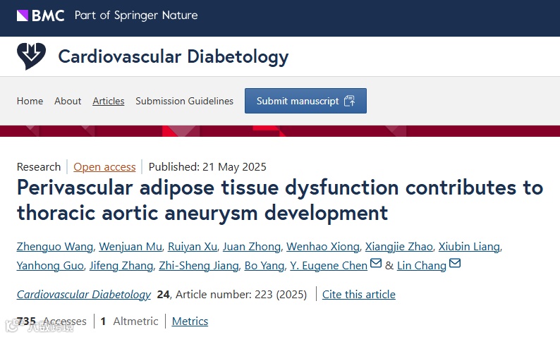 健康状态下,胸段PVAT有着类似棕色脂肪组织(BAT)的特性,然而,当身体处于病理条件时,PVAT会发生白色化转变和功能障碍,这一变化与TAA的发生发展有着怎样千丝万缕的联系呢?5月21日,密歇根大学Lin Chang、Y. Eugene Chen共同通讯在《Cardiovascular Diabetology》发表了一篇影响因子超10分的论文“Perivascular adipose tissue dysfunction contributes to thoracic aortic aneurysm development”,为我们揭开了其中的奥秘。