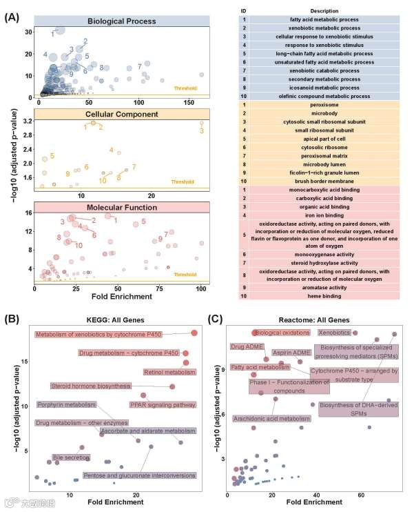 对70个潜在靶点的GO和KEGG富集分析表明,这些基因在以下方面呈现显著富集。细胞组分:过氧化物酶体等;生物学功能:脂肪酸代谢过程、脂质代谢调控等;分子功能:单羧酸结合、氧化还原酶活性等;信号通路:细胞色素P450代谢异生物质通路、脂肪酸降解通路等。上述结果提示,PFOA可能通过干扰脂质代谢相关分子功能及过氧化物酶体活性,并激活细胞色素P450介导的异生物质代谢途径,参与ccRCC的发生发展。