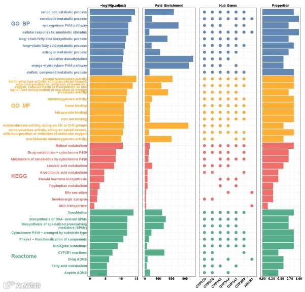 对7个枢纽基因的富集分析表明,这些基因在以下生物学过程、分子功能及信号通路中显著富集:生物学过程:异种分解代谢过程、药物代谢过程、类固醇代谢调控等;分子功能:类固醇羟化酶活性、血红素结合、氧化还原酶活性等;信号通路:视黄醇代谢通路、细胞色素P450介导的外源物质代谢通路、药物代谢-细胞色素P450通路等。上述结果提示,枢纽基因可能通过调控外源性物质(如PFOA)的代谢活化及类固醇激素代谢平衡,参与ccRCC的病理进程。
