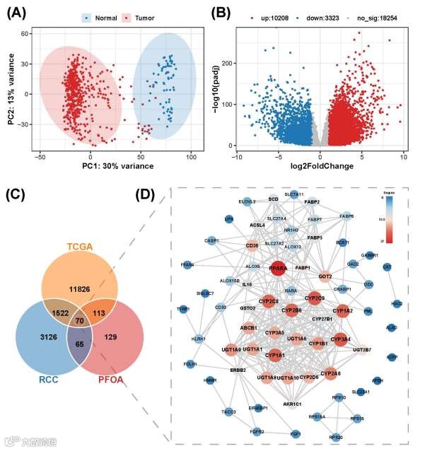 在本研究中,研究者首先从TCGA数据库提取了ccRCC的RNA-seq数据,并通过PCA分析鉴定出13,531个差异表达基因(DEGs)。随后,研究将这些DEGs与多源数据库获取的基因集进行整合分析:从SwissTargetPrediction、ChEMBL和STITCH数据库中获取377个PFOA相关人类靶基因;通过GeneCards和OMIM数据库检索得到4,783个RCC关联基因。通过交叉比对与筛选,最终确定了70个与PFOA诱导ccRCC密切相关的潜在靶点,并构建了蛋白质互作(PPI)网络,为揭示PFOA致ccRCC的分子机制提供了关键切入点。