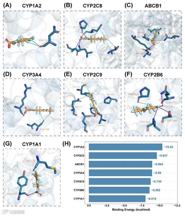 分子对接结果表明PFOA与7个关键枢纽基因之间的结合能均均超过-7.2 kcal/mol阈值,表现出强大的结合稳定性和高亲和力。