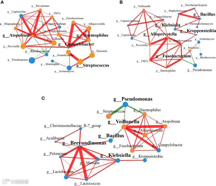 为了确定肺微生物群在有或没有肺癌患者中的相互作用,我们构建了属分类群的相关网络。两组网络表现出不同的细菌相互作用,特别是LC患者的网络比对照组更复杂。通过比较每组网络中网络的拓扑结构,发现LC患者富集属之间的相关性比对照组强。又通过程度中心性(DC)、接近中心性(CC)和中介中心性(BC)来筛选每个网络中有影响力的微生物群(DC >0.1,CC > 0.2,BC>0.1),发现弯曲杆菌,Atopobium,嗜血杆菌和链球菌对LC患者的肺部微生物群落改变很重要。而对照结果显示,芽孢杆菌、梭杆菌、异体杆菌、克雷伯氏菌和克罗彭斯特氏菌对其贡献更大。通过结合16S rRNA扩增子测序得到的显著差异菌属构建了相关性网络。结果表明,Christensenellaceae R - 7与乳酸杆菌属、短波单胞菌、马西利亚呈正相关,他们在对照组中富集,与韦永球菌属、奇异菌属、嗜血杆菌属、梭形杆菌属呈负相关,他们在LC患者中富集。