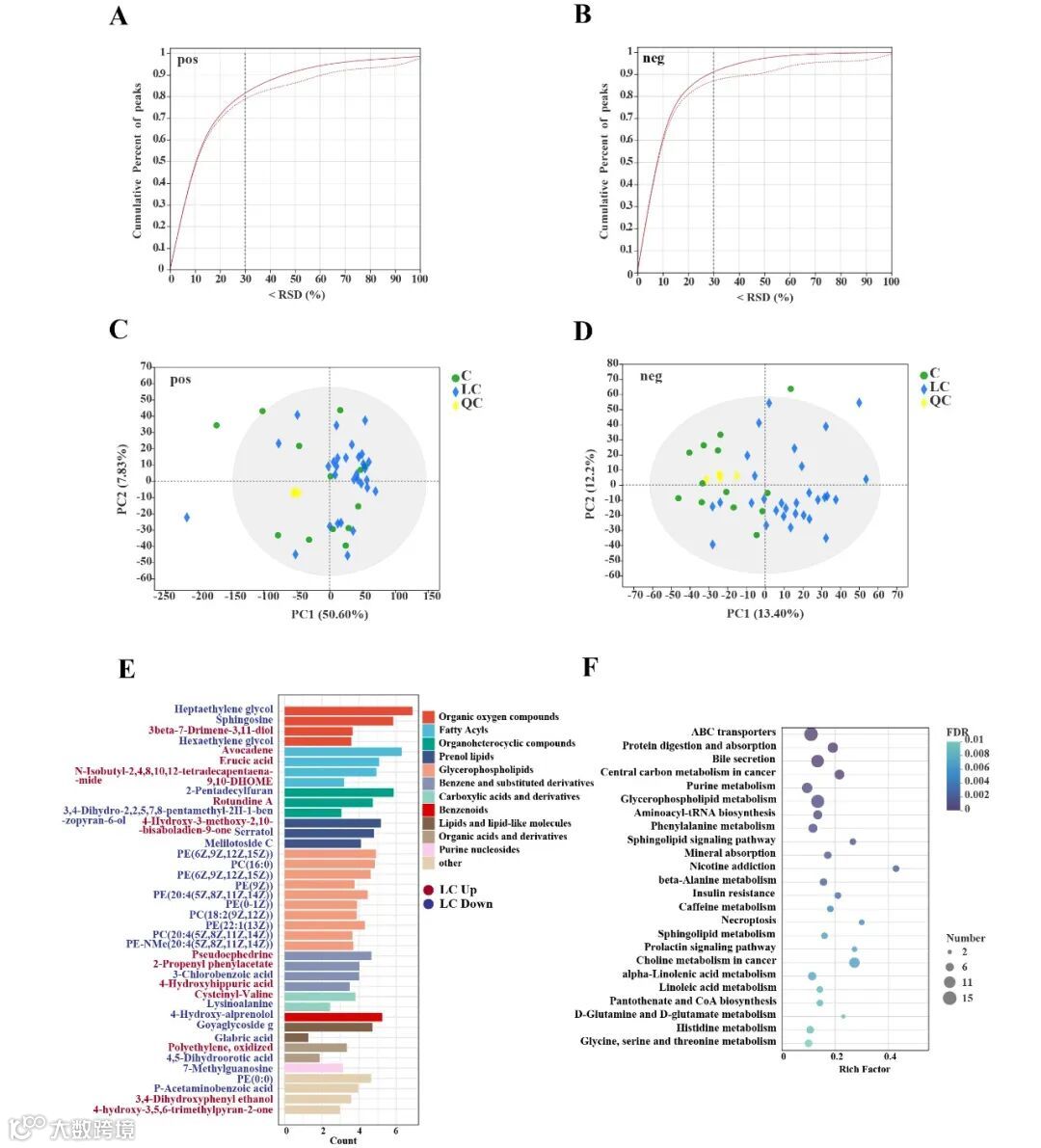 肺组织冲洗溶液样品用于代谢组学分析。对数据进行归一化,相对标准差(RSD)和PCA分析显示代谢组学数据集具有令人满意的稳定性和可重复性。OPLS-DA分析表明,两组样品中代谢物分离明显。通过区分LC患者与对照组的代谢物特征,获得40种代谢物在LC患者和对照组之间的相对丰度存在显着差异,即LC患者中分别有14种和26种代谢物显着上调和下调。其中,几种脂肪酰基如9,10-DHOME、芥酸和N-异丁基-2,4,8,10,12-十四丁基五烯酰胺在LC患者中呈较高水平,一些甘油磷脂如PC(14:0/16:0)和PE(14:1(9Z)/14:1(9Z))在LC患者中下调。KEGG通路富集分析进一步鉴定出130条代谢通路中的24条代谢通路在LC患者和对照中存在显著差异。