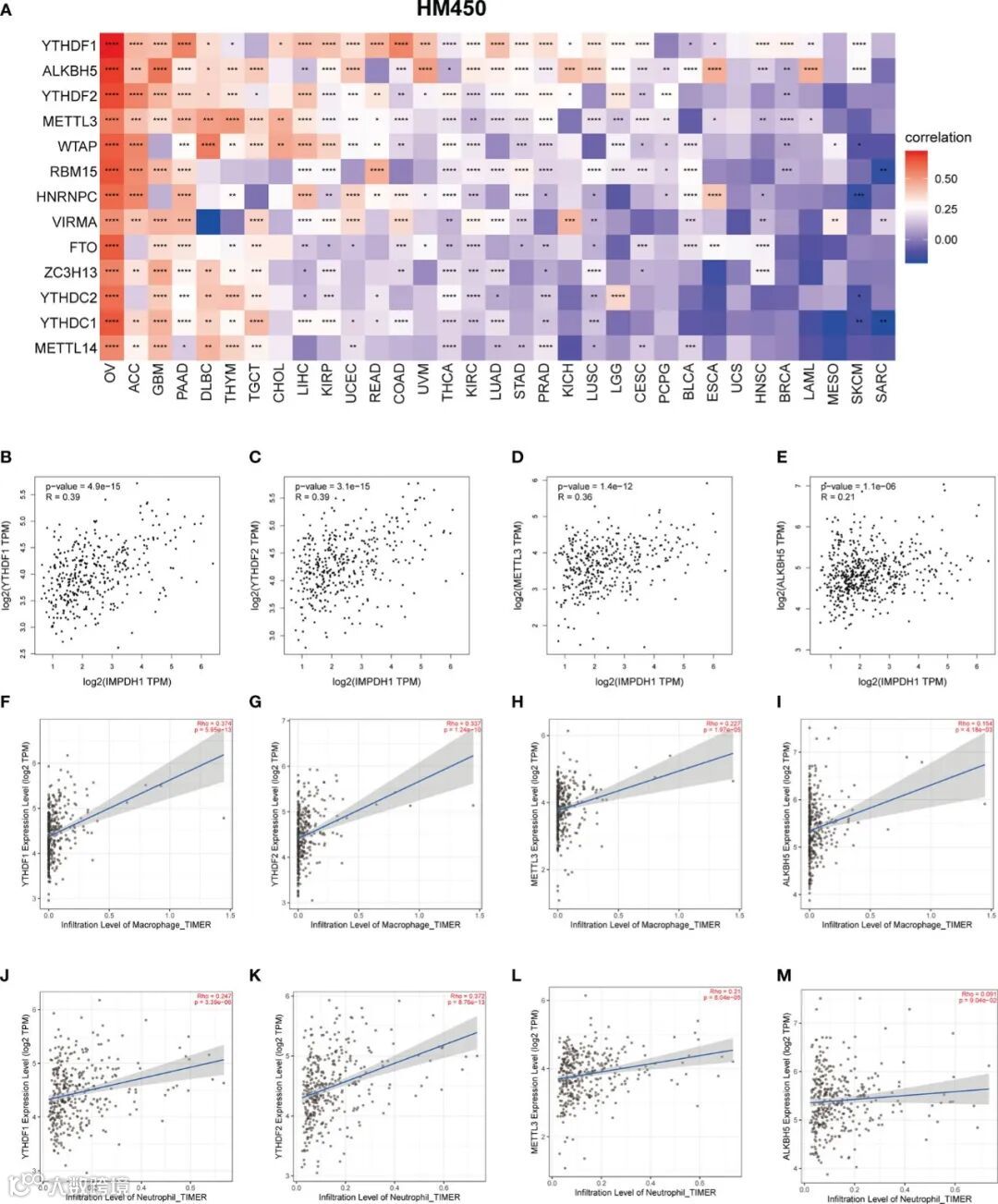 M-6-A是最常见的甲基化修饰,在肿瘤发生发展中具有重要影响。文章评估了IMPDH1与m-6-A调节蛋白的相关性,结果显示IMPDH1在泛癌中与m-6-A相关调节蛋白密切相关(图13A), 同时IMPDH1与HCC中排名前4的蛋白:YTHDF1、ALKBH5、YTHDF2、METTL3具有强相关性 (图13B-E)。分析这4种蛋白与巨噬细胞、中性粒细胞的相关性,可以发现m-6-A修饰蛋白与巨噬细胞和中性粒细胞浸润密切相关(图13F-M)。