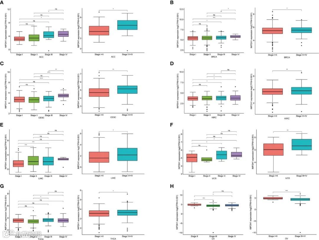 为了更准确地确定IMPDH1的表达,文章分析了IMPDH1在不同TNM分期的表达,发现IMPDH1在7种晚期(3/4期)的肿瘤中有较高的表达:ACC, BRCA, CESC, KIRC, LIHC, UCS, THCA(图2A-G)。IMPDH1在OV早期(1/2期)表达较高(图2H)。此外,文章还评估了IMPDH1在肿瘤及其配对的癌旁组织中的表达,结果显示,在14种肿瘤中,IMPDH1在肿瘤组织中的表达高于配对的癌旁组织(图S1A-N),而仅KICH有相反的结果(图s10)。
