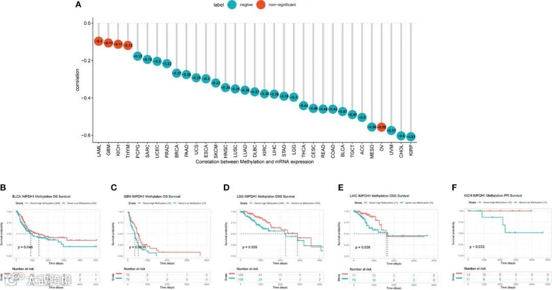 DNA甲基化作为一种常见的共价修饰调控方式,能够控制基因的表达。因此,文章分析了IMPDH1在泛癌中的甲基化水平与表达的相关性,在28种肿瘤中呈负相关(图10A)。此外,一些肿瘤,如BLCA、GBM、LGG、LIHC、KICH也存在与IMPDH1甲基化水平相关的预后差异(图10B-F)。
