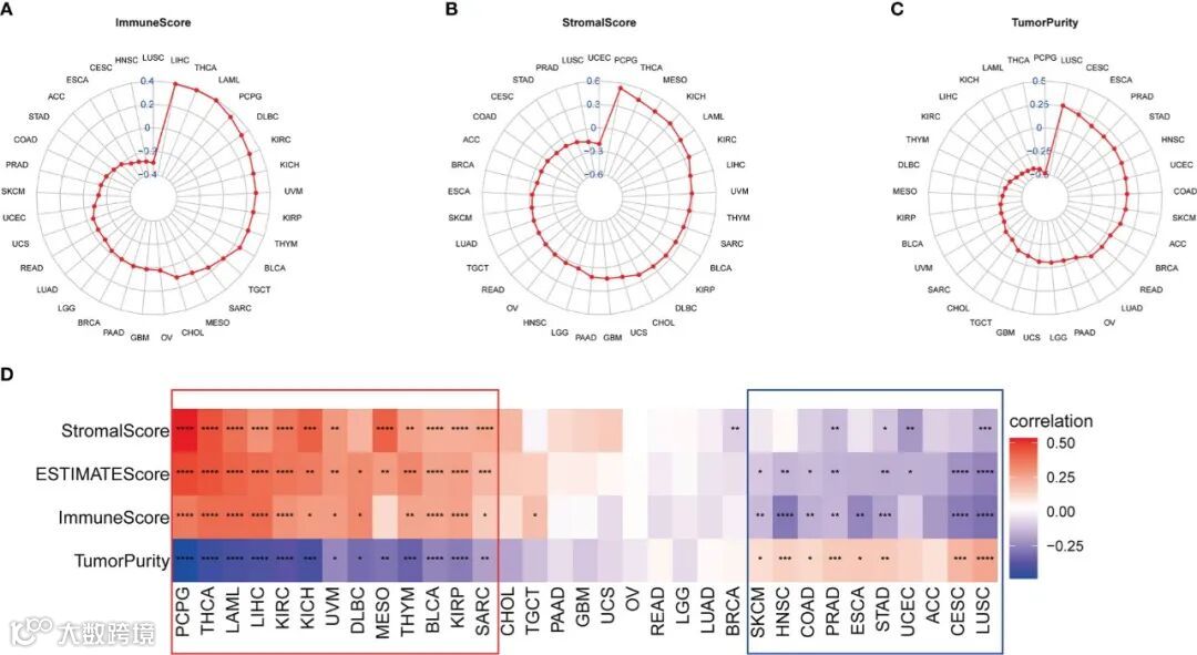 为了进一步探讨IMPDH1对肿瘤发展的影响,文章研究了IMPDH1在肿瘤免疫微环境(TIME)中的作用。文章分析了IMPDH1与免疫评分、基质评分、肿瘤纯度评分的相关性(图5A-C)。结果显示,IMPDH1在PCPG、THCA、LAML、LIHC、KIRC、KICH、UVM、DLBC、MESO、THYM、BLCA、KIRP、SARC等13种肿瘤中与肿瘤纯度评分呈负相关,与免疫评分和基质评分呈正相关。在SKCM、HNSC、COAD、PRAD、ESCA、STAD、UCEC、CESC、LUSC中,IMPDH1与肿瘤纯度评分呈正相关。在2 / 3的泛癌肿瘤中,IMPDH1与Tumor纯度评分和Estimate评分的关联具有统计学显著性(图5D),这意味着IMPDH1可以通过改变大多数肿瘤中的肿瘤微环境来影响肿瘤发展。然而,由于肿瘤类型的不同,IMPDH1对肿瘤微环境评分的影响也产生了相反的结果,IMPDH1如何影响肿瘤进展尚不清楚,这部分内容还需要进一步的工作来探索。