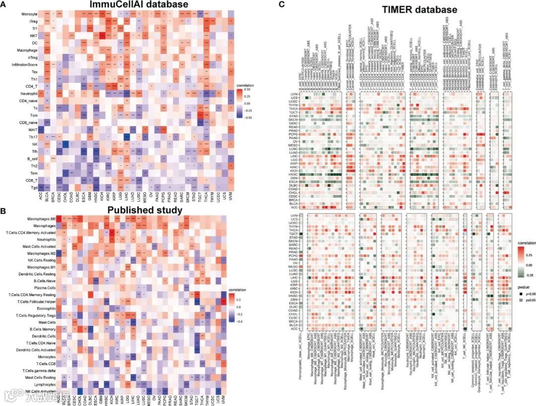 此外文章检测了IMPDH1与肿瘤相关免疫细胞的相关性,结果显示IMPDH1与大多数肿瘤中的大部分免疫细胞有很强的相关性。在ImmuCellAI数据库中,单核细胞被证实是泛癌中最常见的与IMPDH1正相关的免疫细胞,而最常见的负相关细胞是CD8+T和γ δ T细胞(图6A)。同时,使用已发表的研究数据(图6B)和来自TIMER数据库的部分数据(图6C)对结论进行验证,结果与ImmuCell AI数据库的一致性较好。综上所述,在这些数据库中,单核细胞、巨噬细胞、CD8+T细胞、γ δ T细胞与IMPDH1在泛癌中存在显著的相关性。
