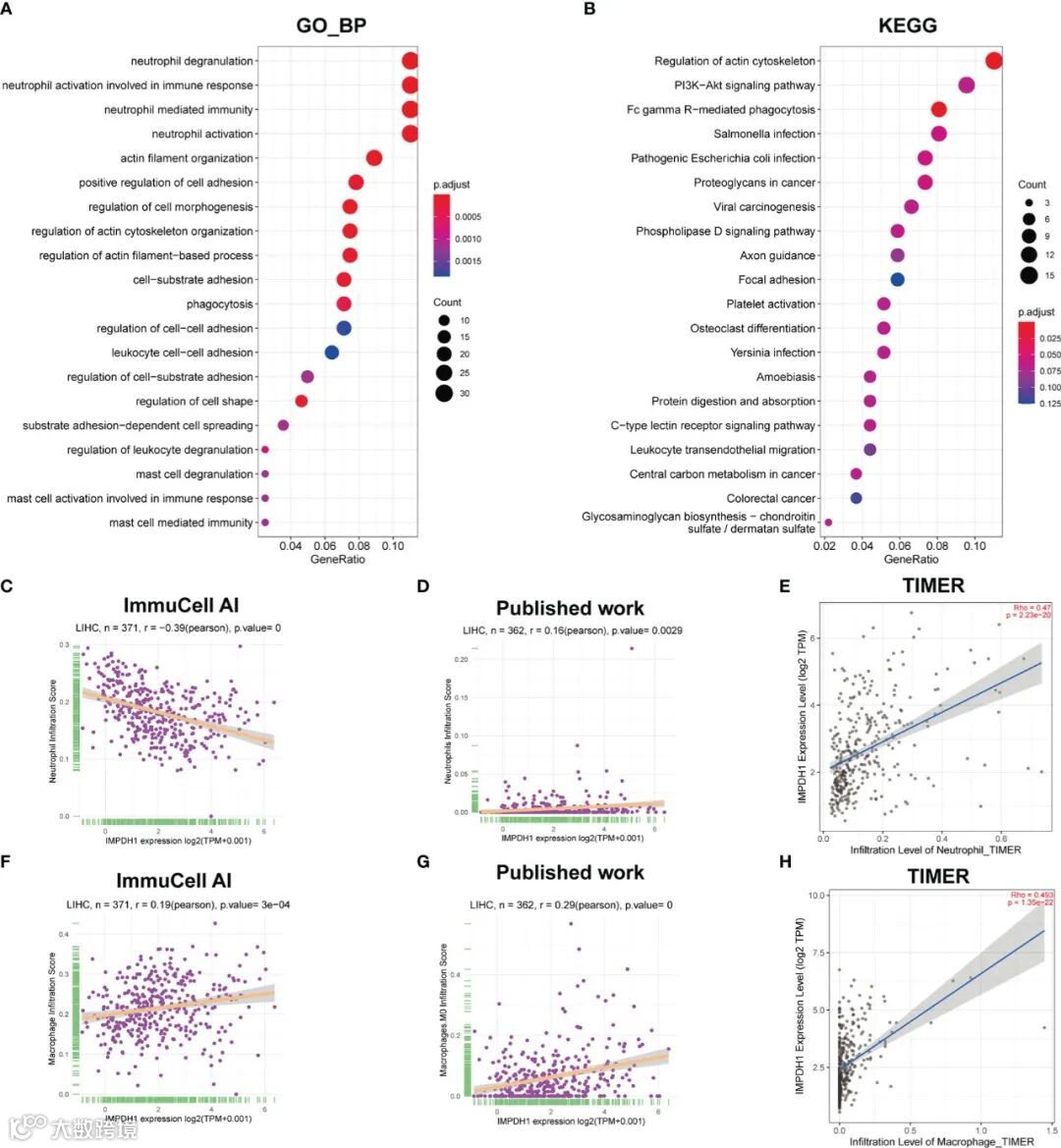 除CD8+T细胞外,IMPDH1的表达对其他免疫细胞的浸润也有较大影响。通过GO (Gene Ontology,图12A)和KEGG (Kyoto encyclopedia of Genes and Genomes)分析(图12B),结果表明IMPDH1参与中性粒细胞脱颗粒、中性粒细胞相关的固有免疫和FC γ r介导的吞噬作用。然后,利用ImmuCellAI数据库、TIMER数据库和之前发表的研究数据集(26,27)分析了肝癌中IMPDH1与中性粒细胞(图12C-E)和巨噬细胞浸润(图12F-H)的关系。发现这两种免疫细胞与IMPDH1的浸润有很强的相关性。