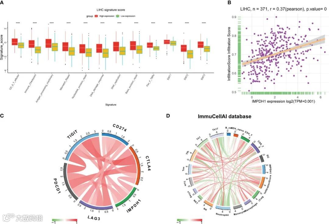 通过分析HCC肿瘤微环境,显示IMPDH1高表达的肿瘤微环境中浸润的CD8+T淋巴细胞和免疫检查点明显增加(图11A),浸润评分也随着IMPDH1的高表达而增加(图11B)。免疫检查点PD-1、TIGIT和CTLA4与IMPDH1密切相关(图11C),它们可能影响免疫治疗的敏感性。在HCC中,IMPDH1与ImmuCellAI数据库显示的许多免疫细胞相关(图11D)。