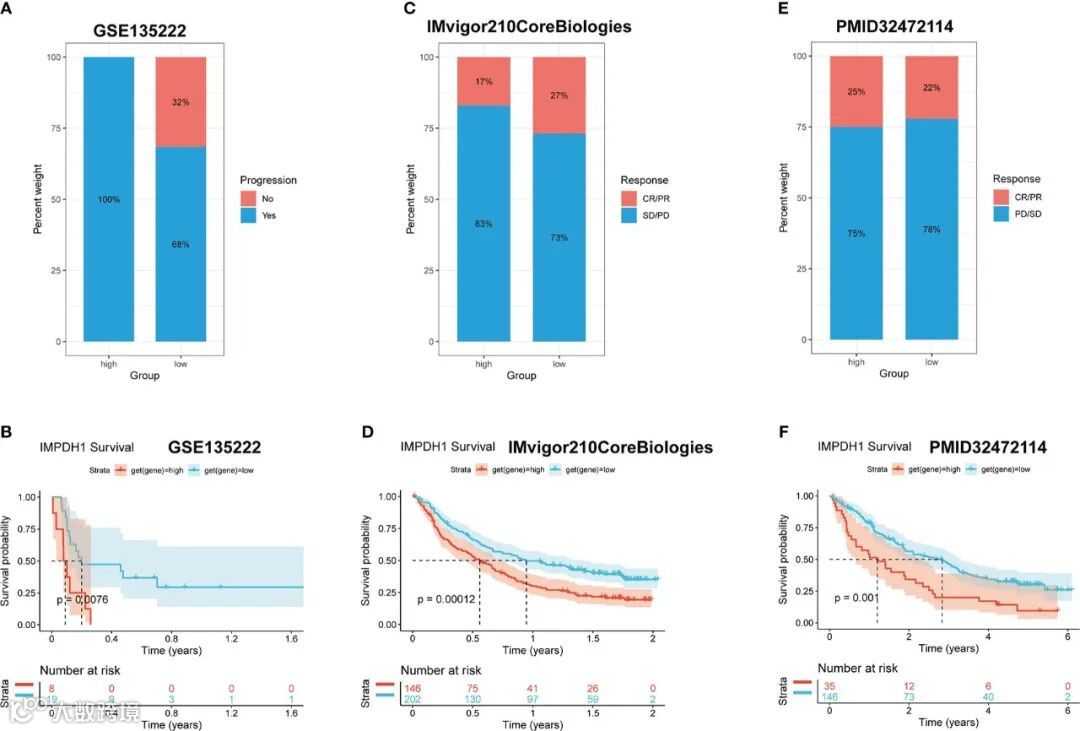 为了进一步了解IMPDH1的表达水平是否与接受免疫治疗的肿瘤患者的预后相关,文章分析了在接受免疫治疗的非小细胞肺癌(图7A、B)、尿路上皮细胞癌(图7C、D)和肾透明细胞癌(图7E、F)的三个队列中,IMPDH1表达亚组的治疗反应和预后的差异。在接受免疫治疗的肿瘤患者中,IMPDH1高表达与低治疗反应和不良预后密切相关。