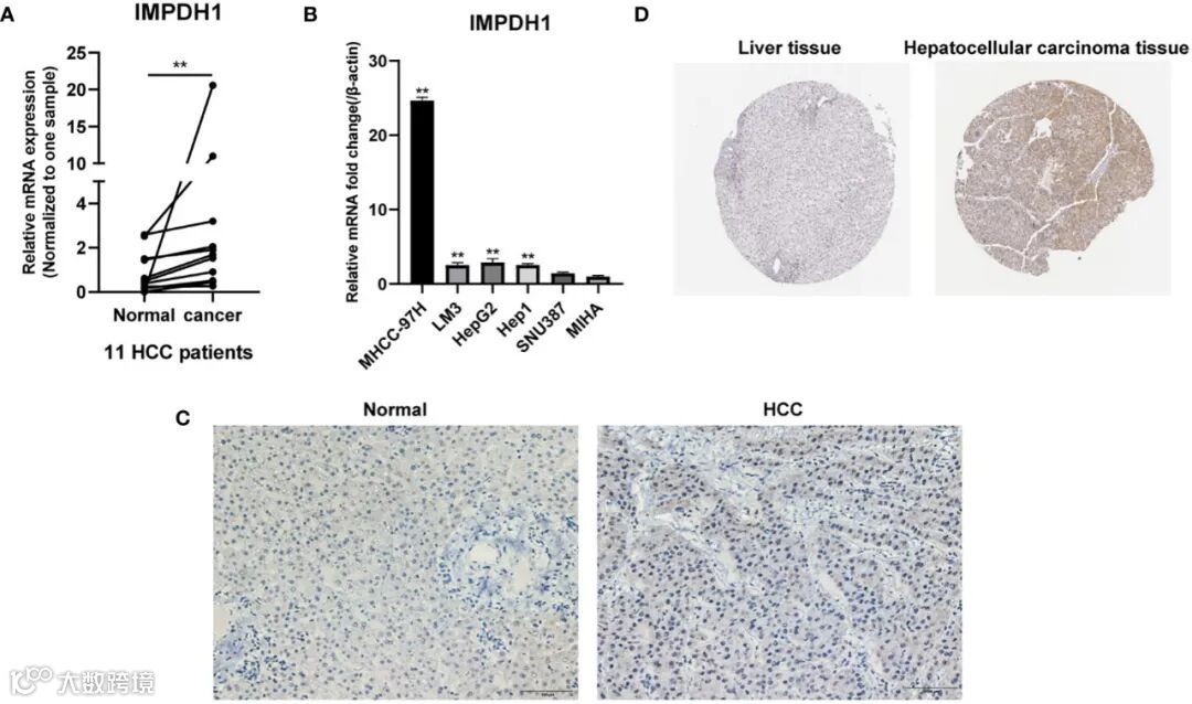 文章进一步通过肝癌患者配对组织、肝癌细胞株和肝细胞株验证IMPDH1的表达。从11例原发性HCC患者的qRT-PCR结果可以看出,与癌旁组织相比,IMPDH1在HCC组织中表达较高(图3A)。同时,HCC和肝细胞的结果表明,IMPDH1在HCC细胞中呈高表达,尤其是在MHCC-97H中,并且IMPDH1在各类型HCC细胞中的表达均高于肝细胞(图3B)。我们还通过免疫组织化学(IHC)验证了IMPDH1在HCC患者癌组织和配对的非癌组织中的蛋白表达和亚细胞定位(图3C), 人类蛋白质图谱的IHC结果与生物信息学分析的结果一致(图3D)。