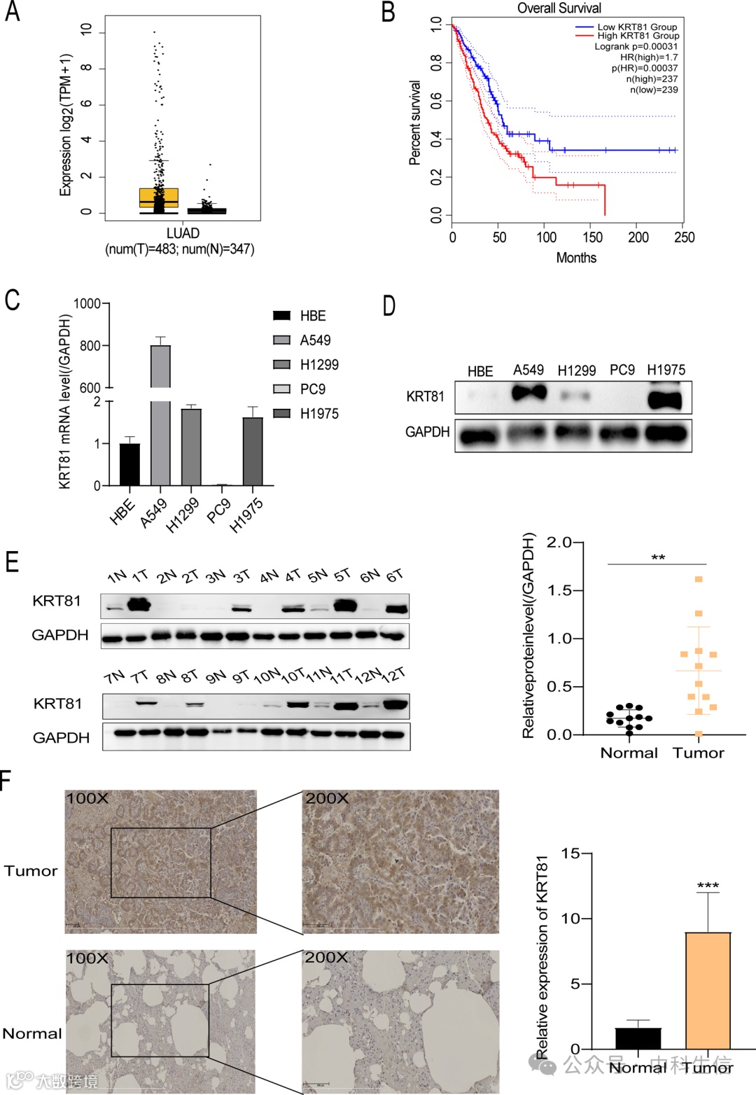KRT81在LUAD细胞和组织中的表达。A:GEPIA2网站上KRT81在483个肺腺癌组织中与347个正常组织中的表达谱;B:高低KRT81表达组的KM曲线;C、D:qRT-PCR和WB检测HBE和A549、H1299、PC9、H1975中KRT81的表达;E:WB检测KRT81在12对LUAD组织中的表达;F:IHC检测LUAD组织中KRT81的表达。**p < 0.01, ***p < 0.001。