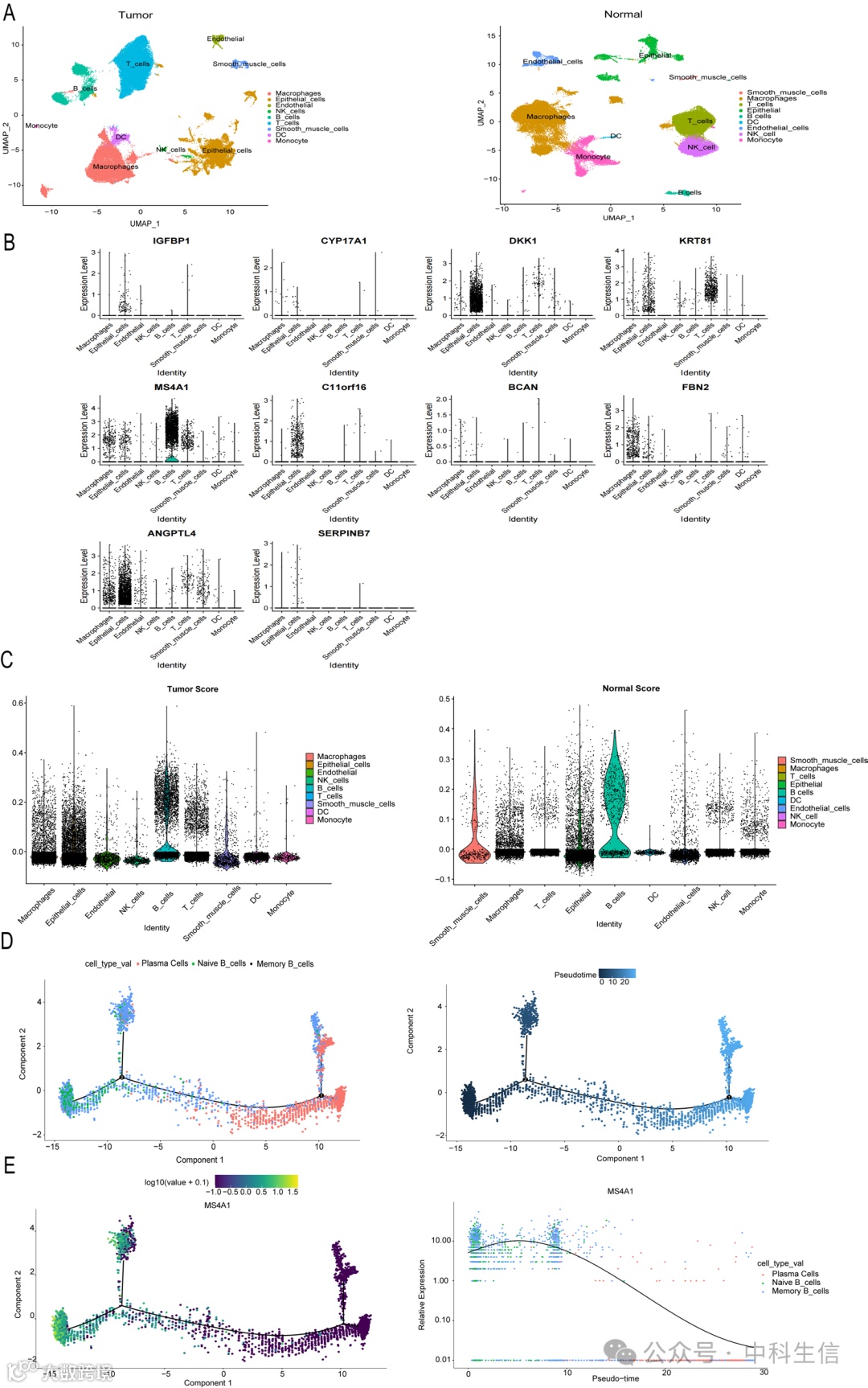 肿瘤和正常组织中的单细胞RNA-seq分析。A:使用UMAP图展示肿瘤组织和正常组织的的细胞聚类和注释情况;B:10个预后基因在不同细胞中肿瘤组织中的表达;C:肿瘤组织和正常组织中预后基因的评分;D:B细胞分化过程的3种细胞亚型;E:MS4A1在3种B细胞亚型分化阶段的表达变化。