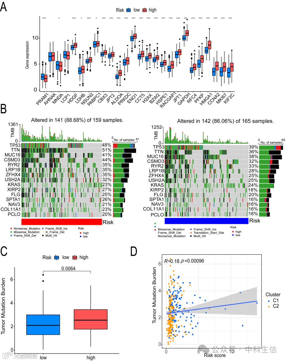 肿瘤突变负荷分析。A:26个LACAGs在高低风险组之间的表达差异;B:瀑布图显示高风险组(159个样本)和低风险组(165个样本)中的前15个突变基因。C、D:高低风险组TMB差异及风险评分与TMB的相关性分析。