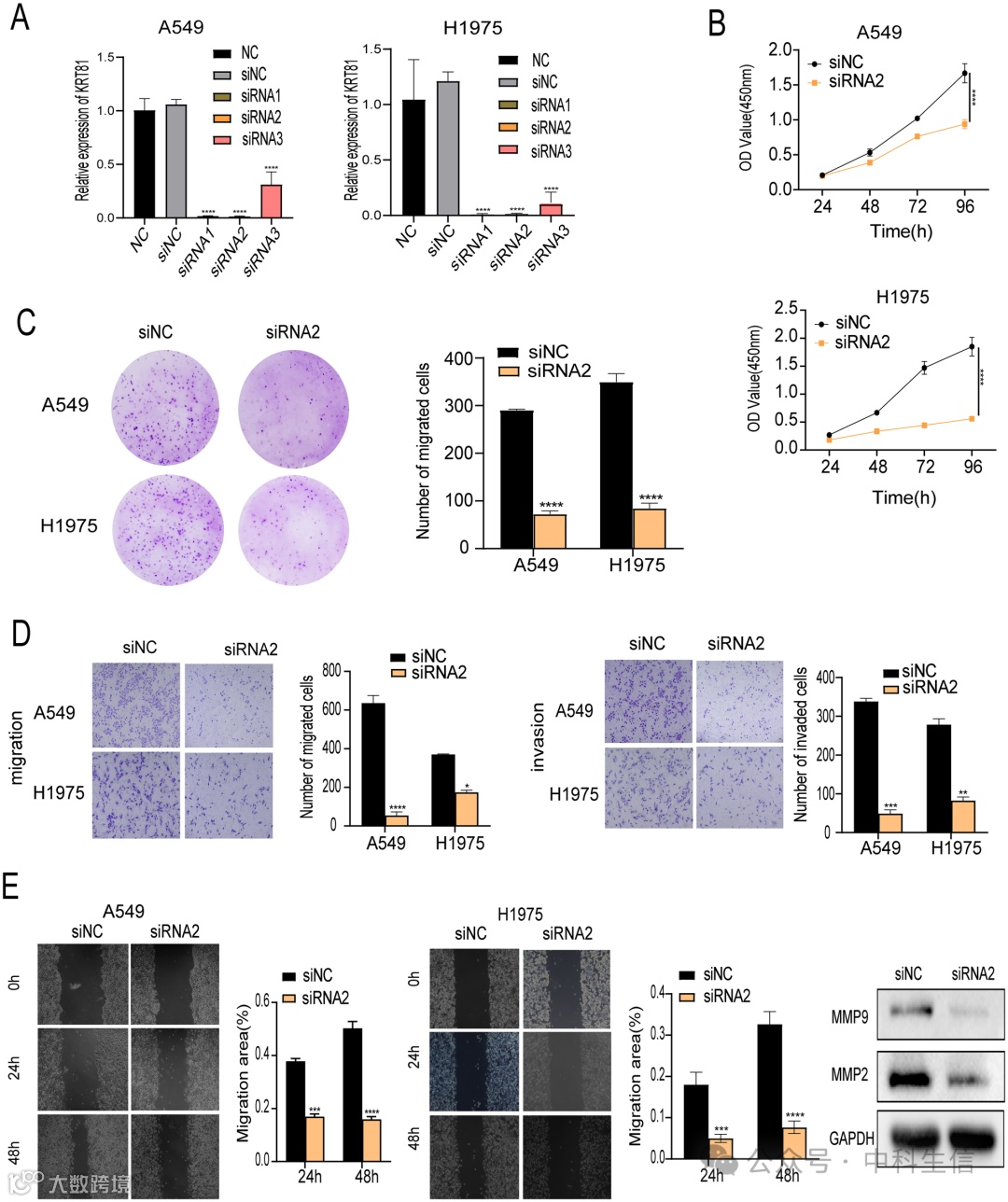 KRT81敲除抑制肺腺癌细胞增殖、迁移和侵袭。A:通过qRT-PCR 测定转染 siRNA1 / 2 / 3 的A549细胞和H1975细胞中KRT81的表达;NC:无 siRNA 感染;siNC:阴性对照。B、C:CCCK8和克隆形成法检测增殖能力;D:Transwell法检测转染siNC和 siRNA2的A549细胞和H1975细胞迁移和侵袭的数量;E:伤口愈合试验检测迁移率;WB法检测转染siNC和siRNA2的A549细胞中迁移相关蛋白(MMP2、MMP9)的表达水平。*p < 0.05, **p < 0.01, ***p < 0.001, ****p < 0.0001
