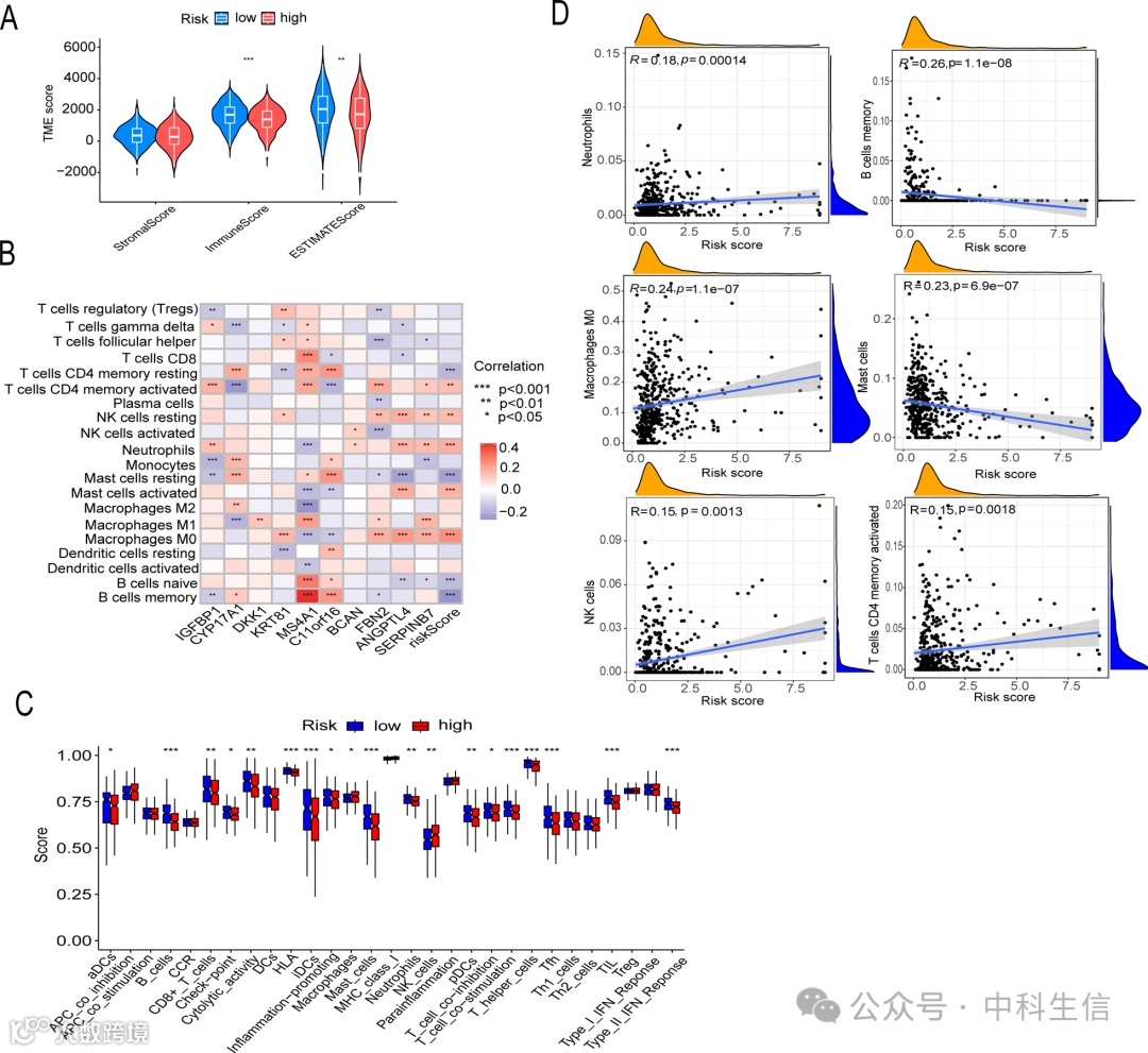 肿瘤免疫微环境和免疫浸润分析。A:高低风险组之间的Stromal Score、Immune Score和Estimated Score;B:10个预后基因和风险评分与免疫细胞的相关性分析;C:高低风险组之间免疫相关特征的差异分析;D:风险评分与免疫细胞之间的相关性分析。