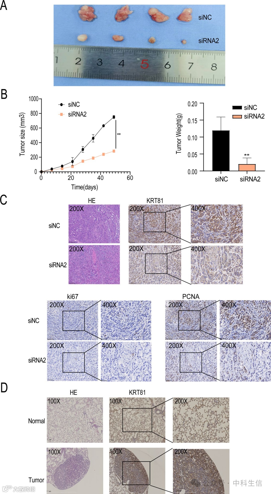 KRT81在裸鼠模型和肺原位模型中促进体内肿瘤发生。A:异种移植肿瘤;B:肿瘤大小和重量;C:IHC检测的增殖蛋白KRT81、Ki67和PCNA的表达水平;D:构建了B6-178 KrasLSL-G12D原位肺癌小鼠模型,IHC检测KRT81的表达。*p < 0.05,**p < 0.01
