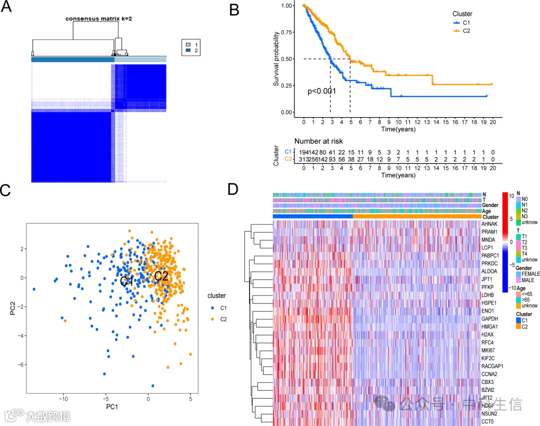 识别LUAD中LACAGs的亚群。A:LUAD的无监督共识聚类分析;B:C1和C2簇的临床生存分析;C:C1和C2簇的PCA分析图;D:LUAD亚型中LACAGs的临床病理特征和表达情况。