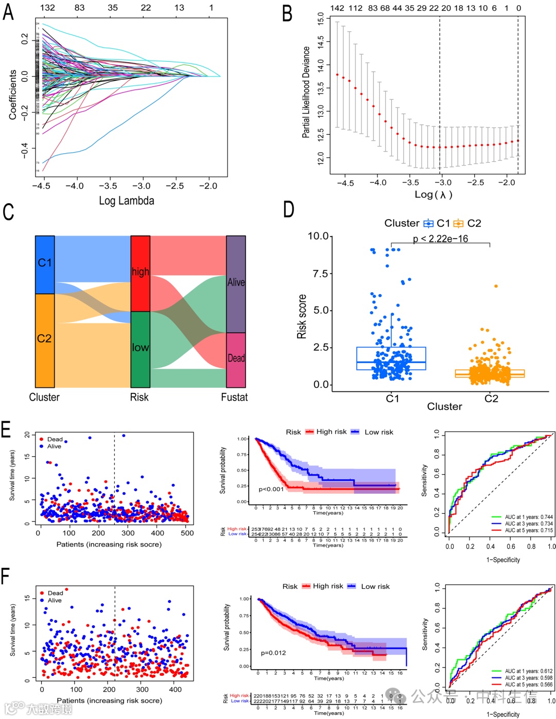 构建风险模型。A、B:LACAGs不同亚型相关的DEGs的LASSO回归分析以确定10个预后基因;C:显示生存状态、不同亚型和风险评分的关系图;D:不同亚型风险评分的差异分析;E:训练集风险评分图、生存状态图以及 1 年、3 年和 5 年的 ROC 曲线;F:验证集风险评分图、生存状态图以及 1 年、3 年和 5 年的 ROC 曲线。