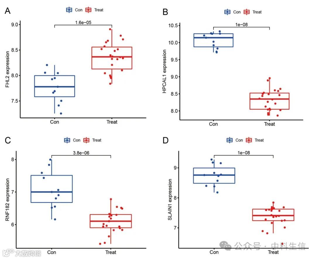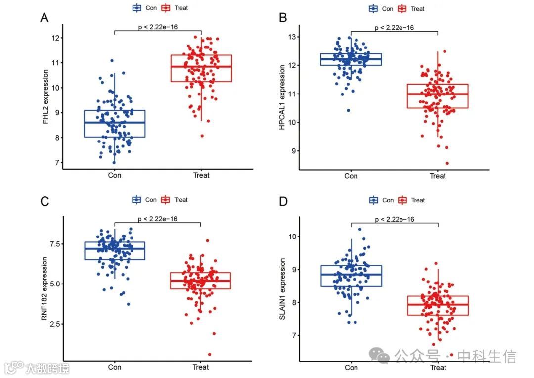 测试集的生物标志物表达差异分析结果与训练集的结果一致。FHL2的表达在IRF组中升高,而SLAIN1、HPCAL1和RNF182的表达在IRF组中降低。