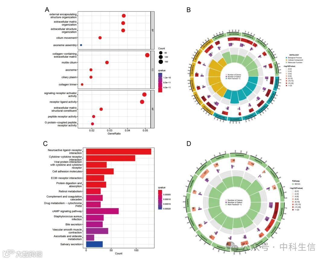 为进一步探索人类IRF差异表达基因的潜在生物功能,进行了GO和KEGG富集分析。GO富集分析结果显示,差异表达基因主要在生物过程方面富集于外部包裹结构、细胞外基质和细胞外结构的组织。在细胞组分方面,这些基因主要涉及含胶原的细胞外基质、运动纤毛和轴丝。在分子功能方面,它们主要集中在信号受体激活、受体配体活性和细胞外基质结构成分上。KEGG富集分析揭示,这些差异表达基因主要富集在15个通路中,例如神经活性配体-受体相互作用、细胞因子-细胞因子受体相互作用和病毒蛋白与细胞因子及细胞因子受体的相互作用。这些结果表明,细胞外基质在IRF中扮演了重要角色。