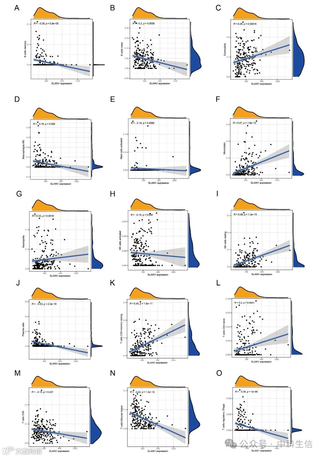 根据生物标志物与免疫细胞相关性分析的结果,SLAIN1与嗜酸粒细胞呈正相关(r=0.26, p<0.001)、单核细胞(r=0.47, p<0.001)、中性粒细胞(r=0.22, p<0.05)、静息NK细胞(r=0.49, p<0.001)、静息记忆CD4 T细胞(r=0.45, p<0.001)以及末成熟CD4 T细胞(r=0.2, p<0.05),并与记忆B细胞呈负相关(r=-0.28, p<0.001)、末成熟B细胞(r=-0.2, p<0.05)、M0型巨噬细胞(r=-0.19, p<0.05)、活化的肥大细胞(r=-0.18, p<0.05)、活化NK细胞(r=-0.15, p<0.05)、浆细胞(r=-0.53, p<0.001)、CD8 T细胞(r=-0.15, p<0.05)、滤泡辅助T细胞(r=-0.43, p<0.001)以及调节性T细胞(Tregs)(r=-0.39, p<0.001)(Fig. S4A-J)。由此可以得出结论,SLAIN1与免疫细胞之间存在相关性。