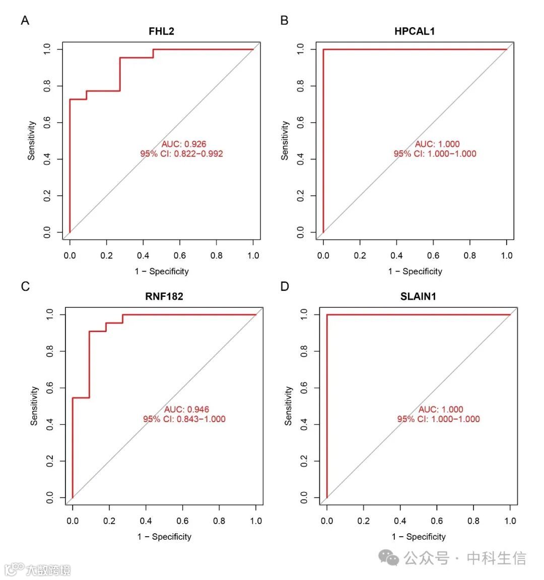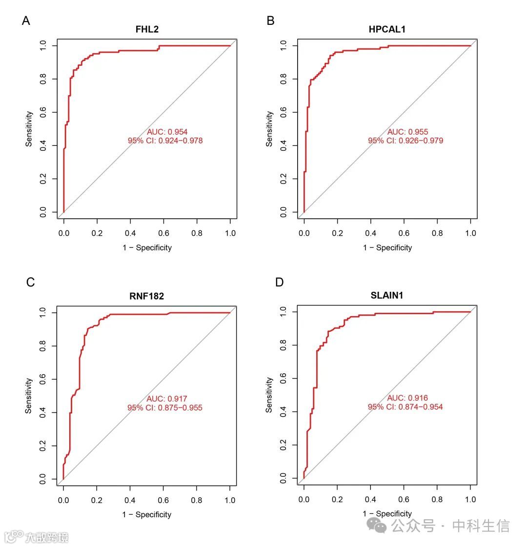 为进一步评估在IRF中鉴定的基因的诊断价值,对训练集和测试集中的四个关键基因进行了ROC分析。结果显示,这四个通过机器学习算法确定的诊断生物标志物,在训练集中展示出强大的诊断能力。FHL2的AUC值为0.954(95% CI 0.924–0.978),HPCAL1的AUC值为0.955(95% CI 0.926–0.979),RNF182的AUC值为0.917(95% CI 0.875–0.955),SLAIN1的AUC值为0.916(95% CI 0.874–0.954)(Fig. S1A-D)。