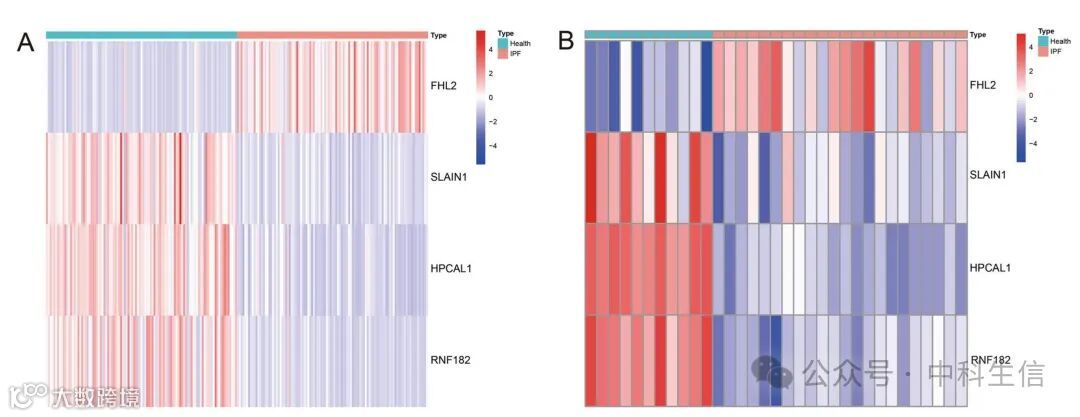 四个生物标志物在训练集和测试集中的表达热图显示,FHL2的表达水平与IPF组呈正相关,而SLAIN1、HPCAL1和RNF182的表达水平与IPF组呈负相关。