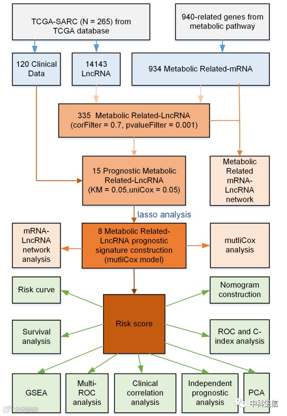 早!今天小编和大家分享一篇21年8月发表在J Orthop Surg Res杂志的文章《Comprehensive analysis of metabolism-related lncRNAs related to the progression and prognosis in osteosarcoma from TCGA》。现在,很多疾病都进行了整体代谢方向的生信挖掘,今天分享的这篇文章利用TCGA数据库中的转录组数据,提取和鉴定骨肉瘤中所有代谢相关的mRNA和lncRNA,并构建了以代谢lncRNA为预后因子的预后特征。下面就一起来看看吧!