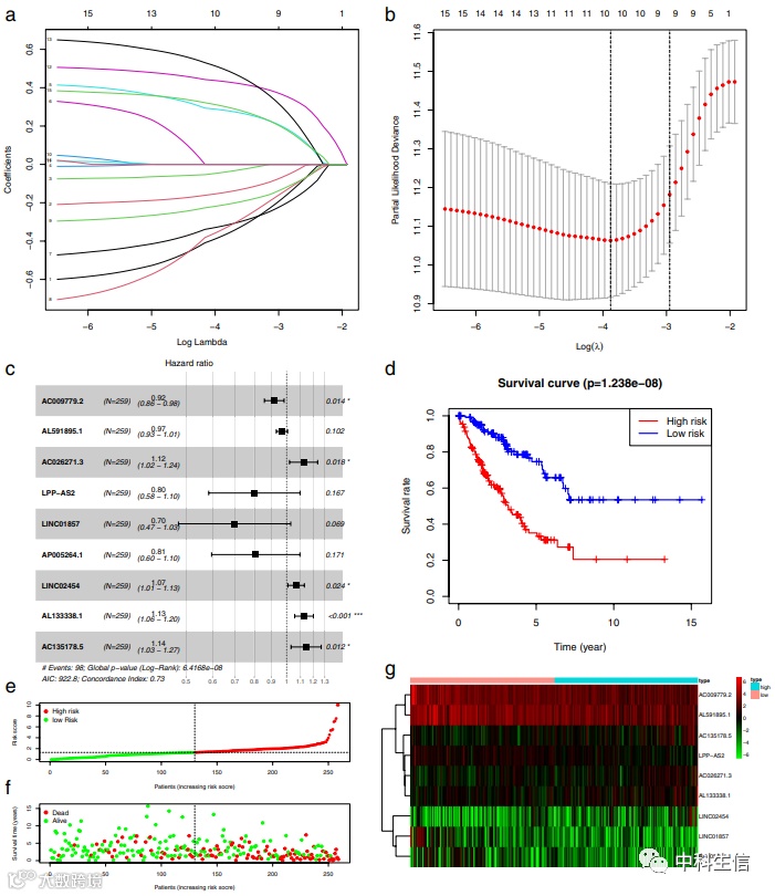 通过Kaplan-Meier生存期(P < 0.05)分析和单变量Cox回归生存率(P < 0.05)分析,获得了15个与预后显著相关的lncRNA。LASSO和多因素cox回归构建了9个基因的风险模型。