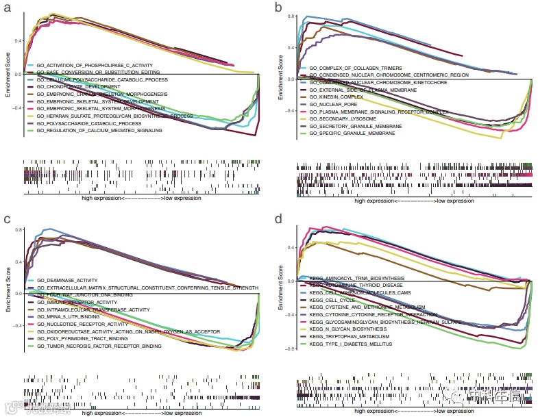 根据中位数将风险评分分为高风险组和低风险组,并对所有样本进行GSEA分析,背景基因集为GO和KEGG。