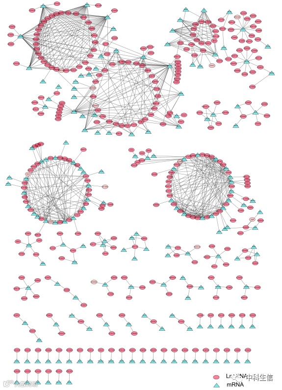 从TCGA-OS转录组数据获得935个代谢相关基因的表达数据,通过分析TCGA-OS的lncRNA与代谢基因的表达相关性,获得了335个与代谢基因高度相关的lncRNA(MRlncRNAs),构建了935个代谢基因和335个MRlncRNA的网络。