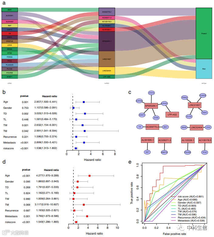 4.代谢相关网络的构建:构建代谢基因和MRlncRNA的共表达网络。同样,还构建了具有预后特征的lncRNA和相关代谢基因网络。