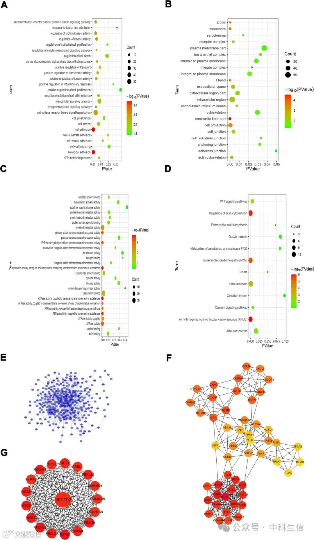 接下来,探讨了HECTD2在胃癌中的作用方式,并利用LinkedOmics在线数据库探索HECTD2的潜在机制。首先,选择了胃癌数据集,构建了HECTD2的共表达网络,并利用热图显示了与HECTD2正相关或负相关的前50个基因(图3A, B)。接着,通过基因组富集分析(GSEA)确定了HECTD2共表达基因的GO生物过程类别。结果显示,HECTD2及其共表达基因主要参与了“通过浆膜粘附分子的细胞-细胞粘附”(图3C)。然后,进行了京都基因组百科全书(KEGG)通路分析,结果显示共表达基因涉及“细胞粘附分子”和“病灶粘附”(图3D)。这些结果表明,HECTD2可能通过调控肿瘤细胞的粘附和间质重塑来促进癌症的进展。