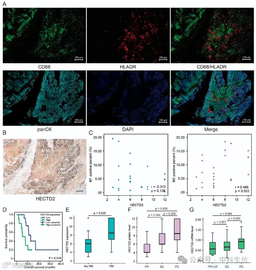 基于HECTD2与巨噬细胞浸润存在明显的正相关和负相关,应用多重免疫荧光检测法研究了胃癌标本中HECTD2表达与M1、M2巨噬细胞浸润的相关性(图6A)。图6B显示了相应切片的IHC图像。结果显示,HECTD2的高表达明显诱导了M2巨噬细胞的浸润。统计分析显示,HECTD2与M2巨噬细胞表达呈正相关(r = 0.466,p = 0.022,图6C),但与M1巨噬细胞呈负相关(r = -0.313,p = 0.136)。统计分析显示,HECTD2高表达的胃癌患者预后较差(图6D),这与之前的在线数据分析结果一致。在腹膜转移的胃癌患者中,HECTD2的表达更高(图6E),进一步证实了HECTD2是胃癌腹膜转移的有效预测指标。