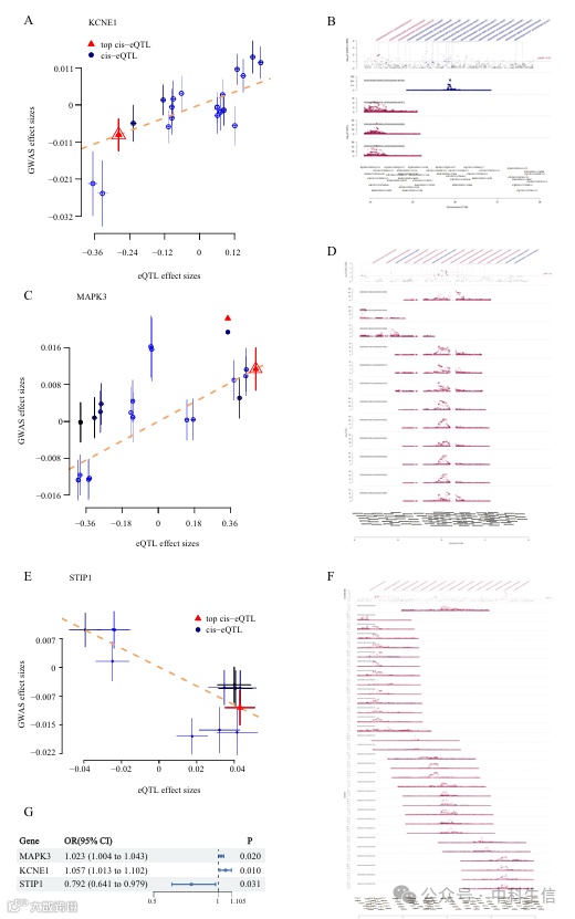 进行SMR分析,以评估这32个关键基因与MDD的关联强度(P值为0.05作为统计显着性的阈值,结果显示KCNE1表达升高与MDD比值之间存在关联(OR = 1.057,95% CI = 1.013–1.102,P 值 = 0.010)(图9A、B、G)。同样,MAPK3表达升高与MDD比值较高相关(OR = 1.023,95% CI = 1.004–1.043,P 值 = 0.020)(图9C、D、G),而STIP1的上调与MDD比值降低相关(OR = 0.792,95% CI = 0.641–0.979,P 值 = 0.031)(图9E、F、G)。