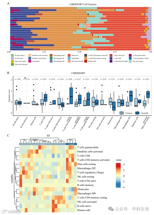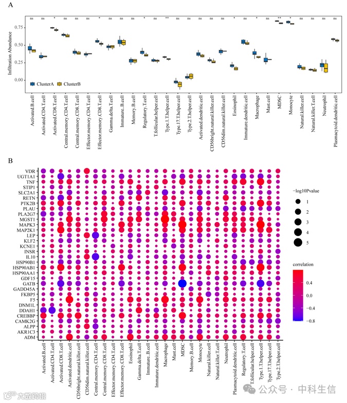 免疫细胞浸润是大脑OS的主要驱动因素,表明对OS相关MDD发病机制有重要贡献。我们采用Cibersort分析来计算GSE39653数据集中22个免疫细胞的浸润状态(图7A),然后通过Wilcoxon检验比较每种免疫细胞类型的相对丰度。CIBERSORT算法还用于比较集群A和集群B之间的免疫细胞浸润概况(图7B)。结果显示,树突状细胞和活化的肥大细胞在簇B中高度丰富,并且大多数免疫细胞亚群的相对丰度在簇之间不同(图7C)。此外,ssGSEA算法表明,在聚类A的MDD样本中,活化的CD8 + T细胞、效应记忆CD8 + T细胞、调节性T细胞、1型T辅助细胞、嗜酸性粒细胞、巨噬细胞和单核细胞的浸润更大(图8A)。此外,丰度与32种关键基因的表达水平相关(图8B)。