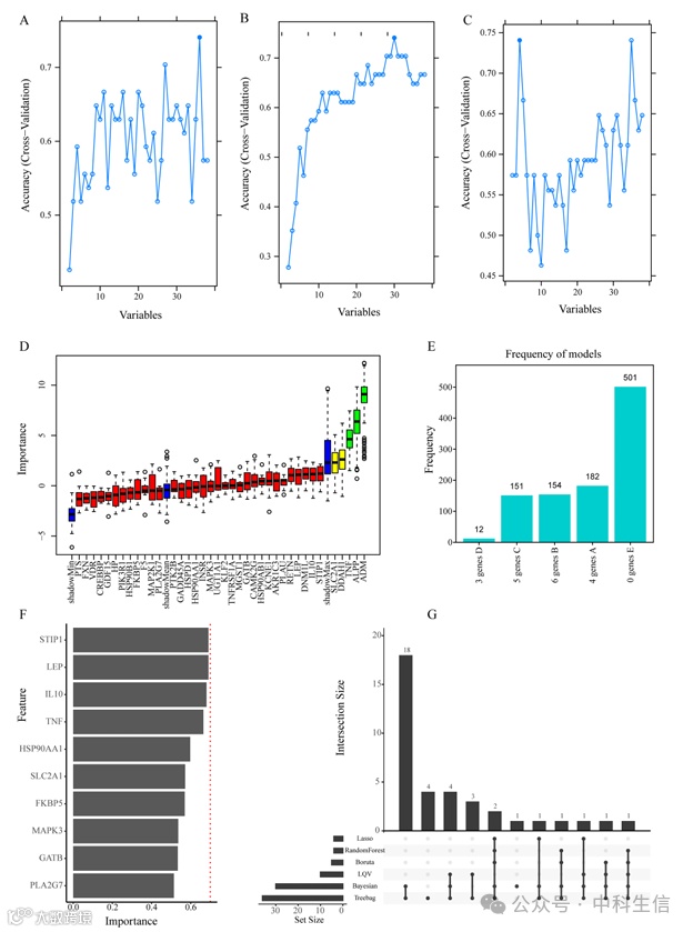 在数据集GSE39653中,基于候选基因,使用6种机器学习算法鉴定关键基因,并在GSE98793数据集验证模型性能。Bagged Trees算法(图4A)、贝叶斯算法(图4B)、随机森林算法(图4C)、包装器算法(Bpruta)(图4D)、LQV(图4E)和10倍交叉验证LASSO回归模型(图4F),确定了32关键基因(图4G):ADM、AKR1C3、ALPP、CAMK2G、CREBBP、DDAH1、DNM1L、F5、FKBP5、GADD45A、GATB、GDF15、HSP90AA1、HSP90AB1、HSP90B1、IL10、INSR、KCNE1、KLF2、LEP、MAP2K1、MAPK3、MGST1、PLA2G7、PLAU、PTK2B、RETN、SLC2A1、STIP1、TNF、UGT1A1和VDR。