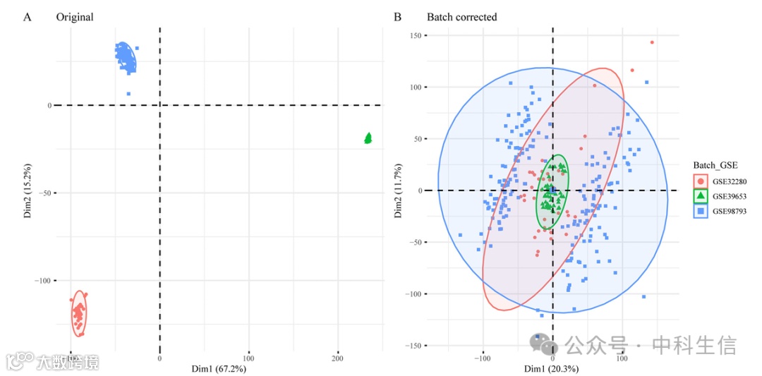 使用R包“cbind”函数组合GEO数据集GSE32280、GSE39653和GSE98793,并使用“sva”包减轻批次偏差(图1A-B)。使用Limma在MDD和对照(HCs)之间共鉴定出596个DEGs,包括294个上调基因和302个下调基因,火山图(图2A),热图(图2B)展示。