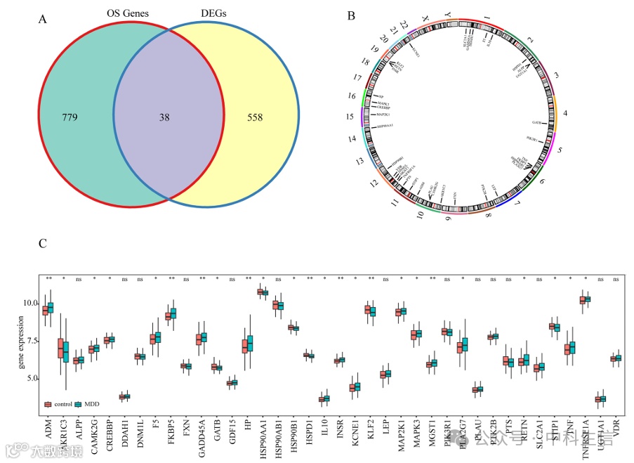 为了鉴定与OS相关的MDD基因,将GeneCards中OS相关性评分为≥7的817个基因与DEGs取交集,获得38个MDD-OS相互作用基因,定义为候选基因(图3A)。对候选基因进行了染色体定位分析(图3B)。进一步进行候选基因的表达量分析,显示AMD、ALPP、CAMK2G、DDAH1、KCNE1、LEP、MAPK3、IL10、PINK1和SLC2A1在MDD中显著上调(图3C)。
