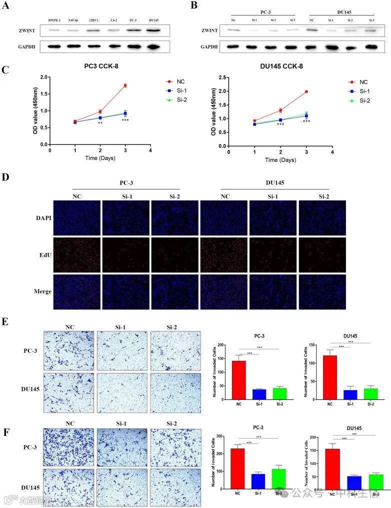 通过对模型基因的风险组进行差异表达分析,发现ZWINT在高危组中富集(Supplementary Figure S1),提示ZWINT可能在前列腺癌的进展中起重要作用。免疫组化结果显示,前列腺癌组织中ZWINT的数量明显高于良性前列腺增生组织(图12A)。UALCAN和GEPIA2数据库的分析结果也证明,前列腺癌患者随着Gleason评分的升高,ZWINT的数量逐渐增加,与预后较差相关(图12B-D)。然后,使用TISCH2数据库(GSE137829(图13A和E)和GSE143791(图13F和J))的数据进行ZWINT单细胞分析。发现ZWINT在各种类型的细胞中均有表达,尤其是恶性细胞。综上所述,ZWINT有望成为前列腺癌新的诊断和预后指标。体外实验验证了这一假设。western blot结果显示,DU-145和PC-3的ZWINT表达水平最高;si-ZWINT#1和siZWINT#2的敲除效率也最高(图14A-B)。为了研究ZWINT对细胞增殖的影响,我们进行了EDU和CCK-8检测。结果表明,sizwint# 1和si- zwint# 2处理后的细胞增殖能力低于si- nc处理组(图14C-D)。然后我们进一步在体外测试了ZWINT的侵袭和迁移作用。transwell实验结果显示,敲低ZWINT显著抑制了DU-145和PC-3的体外侵袭和迁移能力(图14E-F)。总的来说,这些结果表明ZWINT促进了前列腺癌的恶性进展。