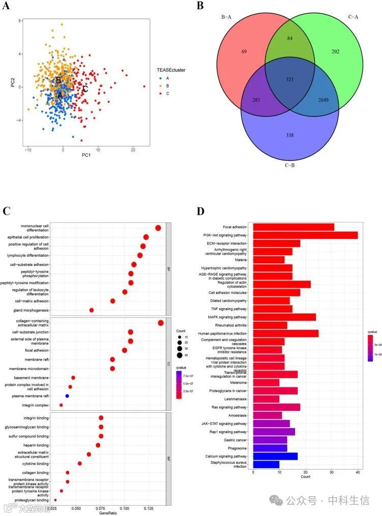 主成分分析表明,根据TEASEs的基因表达可以很好地区分三种不同的亚型(图4A)。随后对3个亚型(A-B、A-C、B-C)进行两两差异分析,得到321个有共同交集的差异表达基因(deg)(图4B)。GO和KEGG显示321 DEGs结果表明,DEGs主要参与细胞分化、粘附和增殖等生物过程。此外,这些DEGs与细胞质和基膜等细胞成分有关。它们还被发现与分子功能上的物质组合有关(图4C)。此外,KEGG分析显示,deg参与多种在肿瘤进展中起关键作用的信号通路,如PI3K-AKT、JAK-STAT、MAPK和Ras信号通路(图4D)。