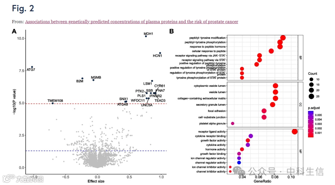 Fig.2 前列腺癌相关血浆蛋白及其富集途径。A血浆蛋白与前列腺癌风险之间的关系。蓝色虚线表示P<0.05,红色虚线表示P<1.14e-5。B. 308个与前列腺癌显著相关的蛋白的基因本体富集分析