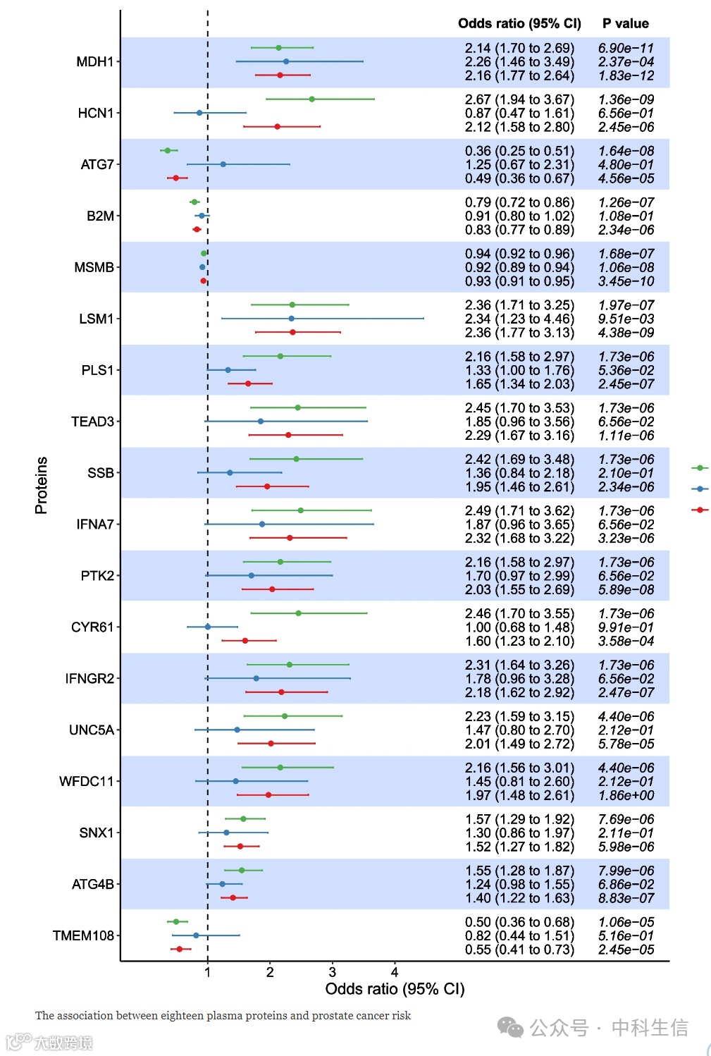 图3 18种血浆蛋白与前列腺癌风险的关系